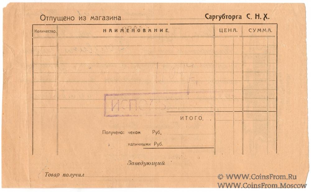Чек. Двухсторонний оформленный, с оттиском печати ГУБТОРГА, штампом на реверсе и подписями ответственных лиц.