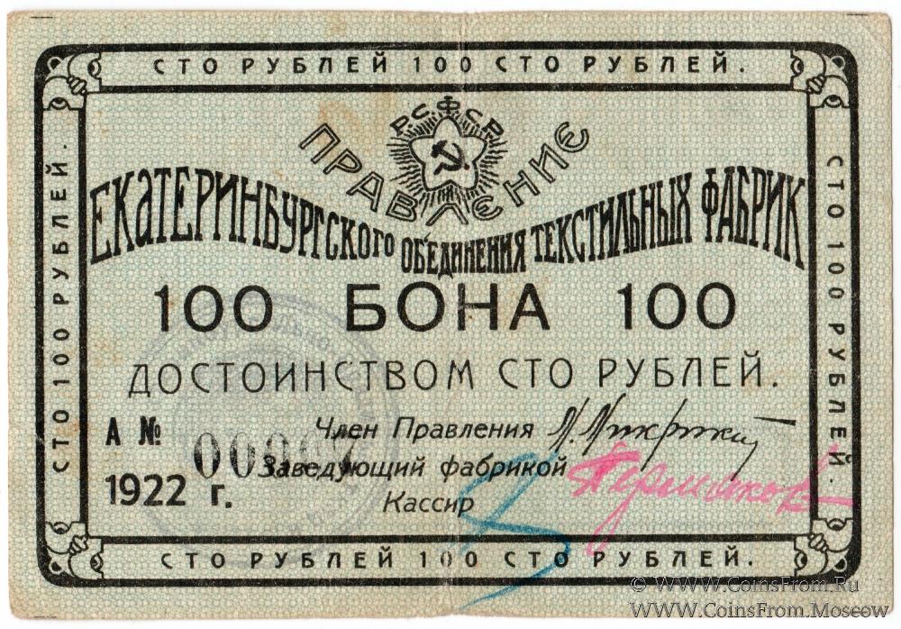 Печать круглая: Герб РСФСР (по центру) / "Екатеринбург. Льно-Прядильн. ткац. и шпаг. фабр. *" (по кругу).