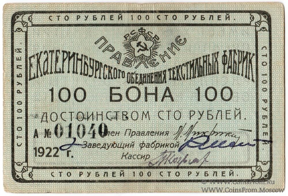 Печать круглая: "Р.С.Ф.С.Р." (по центру) "с. Арамиль" (по центру снизу полукругом) / "Уральская Суконная фабрика ***" (по кругу).