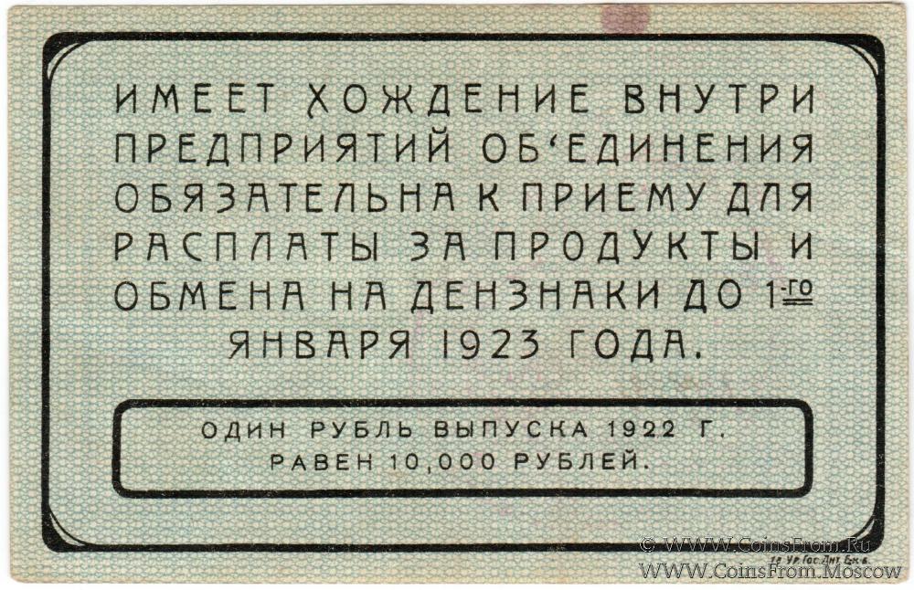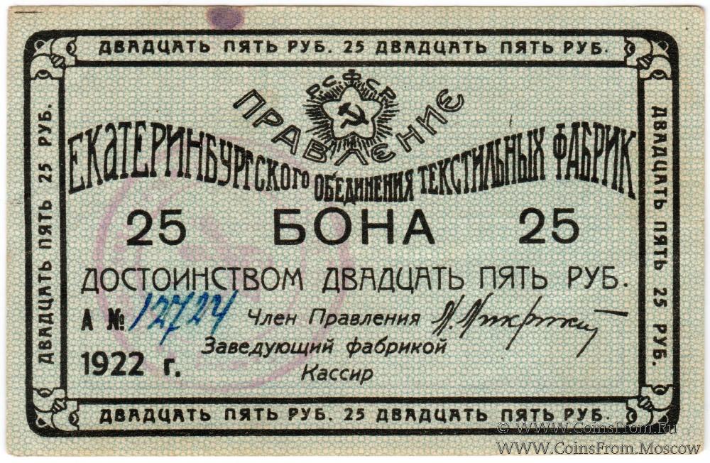 Бона 1922 г. Печать на аверсе (Екатеринбургская Льно-Прядильная ткацкая фабрика имени Ленина). Правление Екатеринбургского объединения текстильных фабрик.