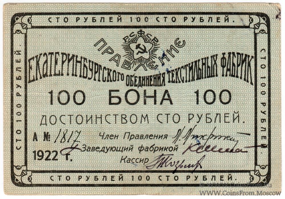 Печать круглая: "Р.С.Ф.С.Р." (по центру) "с. Арамиль" (по центру снизу полукругом) / "Уральская Суконная фабрика ***" (по кругу).