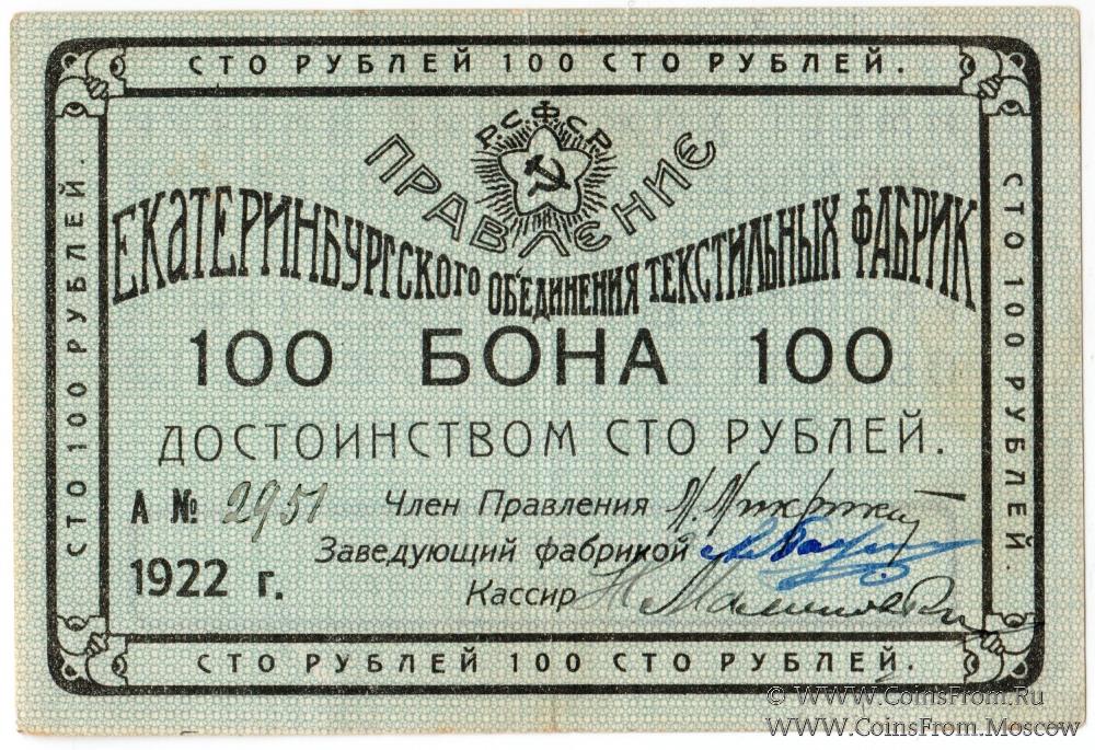 Бона 1922 г. Номер рукописный. Без печати. Правление Екатеринбургского объединения текстильных фабрик.