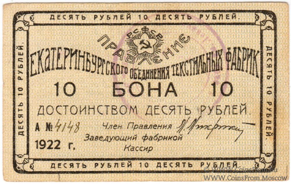 Бона 1922 г. Без подписей. Печать на аверсе (Екатеринбургская Льно-Прядильная ткацкая фабрика имени Ленина). Правление Екатеринбургского объединения текстильных фабрик.