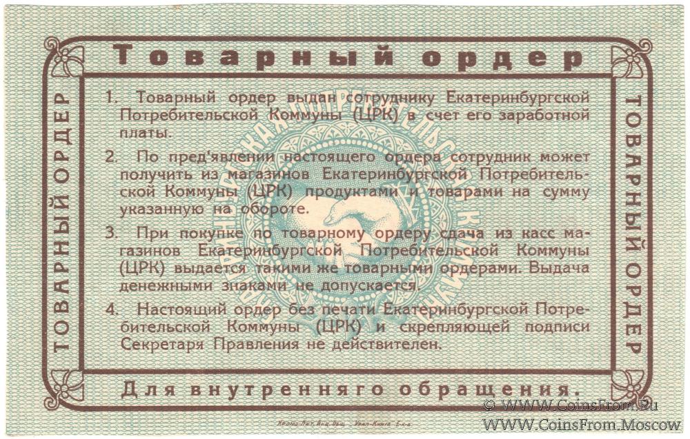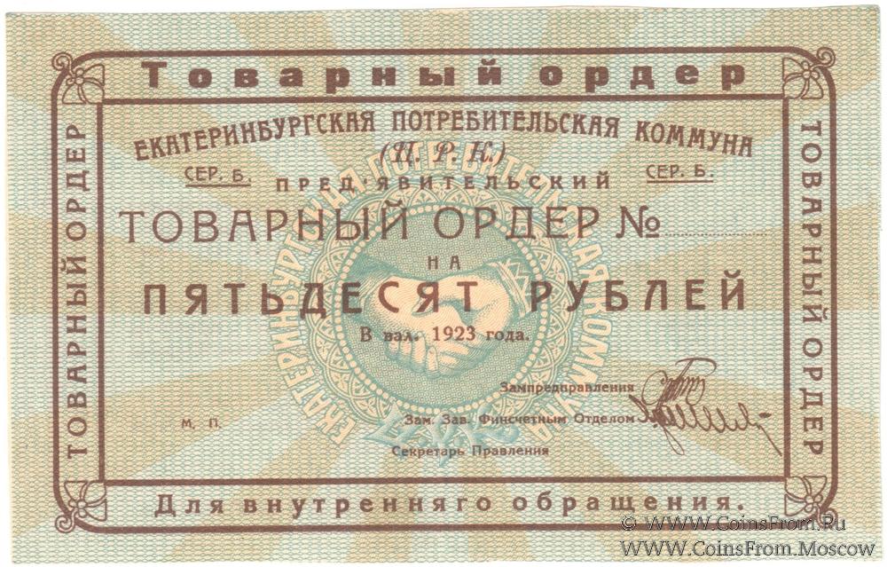Товарный ордер (в валюте 1923 г.). Серия Б. Бланк. Без номера. Екатеринбургская Потребительская коммуна (Ц.Р.К.).