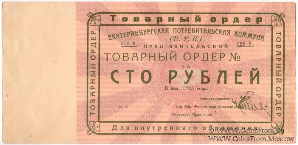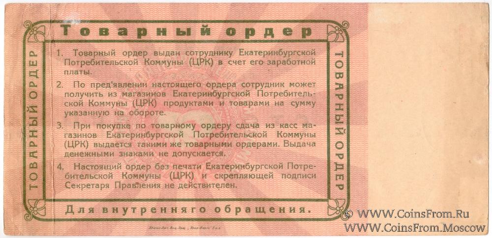 Товарный ордер (в валюте 1923 г.). Серия В. С белым полем слева. Текст и рамка зелёные. Екатеринбургская Потребительская коммуна (Ц.Р.К.).