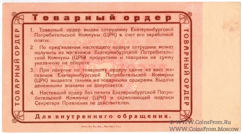Товарный ордер (в валюте 1923 г.). Серия Б. С белым полем слева. Текст и рамка коричневые. Екатеринбургская Потребительская коммуна (Ц.Р.К.).