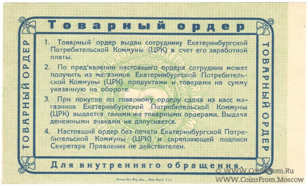 Товарный ордер (в валюте 1923 г.). Серия А. С белым полем слева. Текст и рамка синие. Екатеринбургская Потребительская коммуна (Ц.Р.К.).