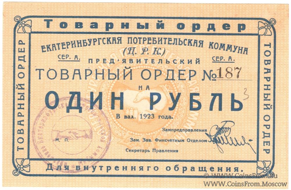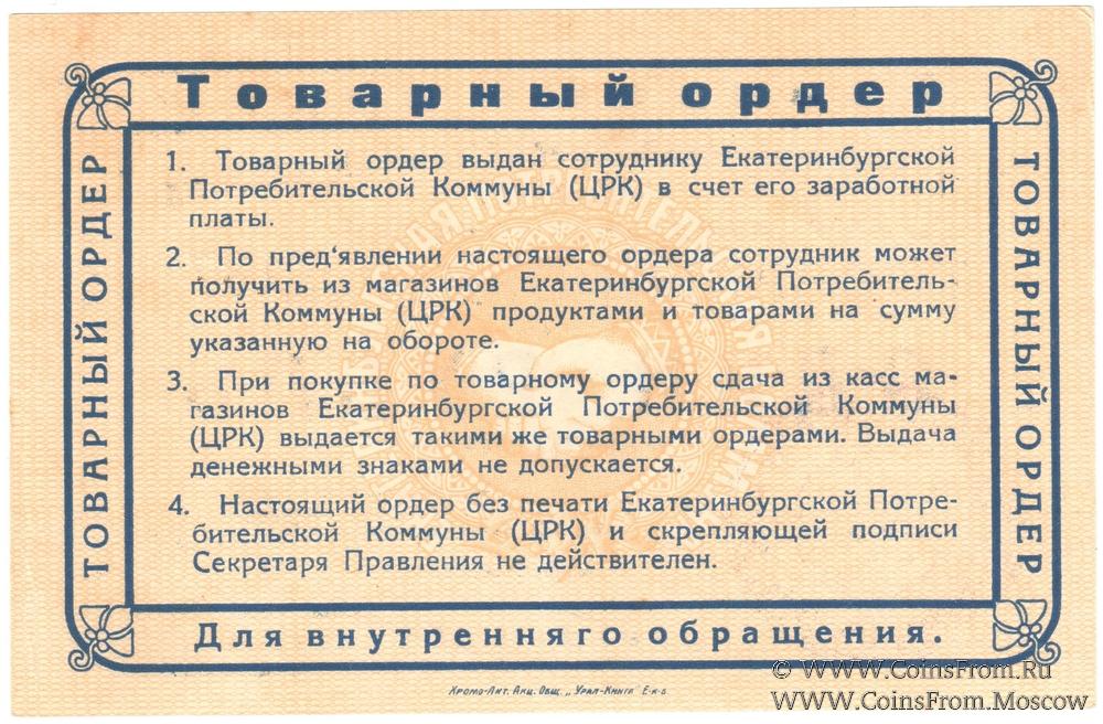 Товарный ордер (в валюте 1923 г.). Серия А. Текст и рамка синие. Екатеринбургская Потребительская коммуна (Ц.Р.К.).