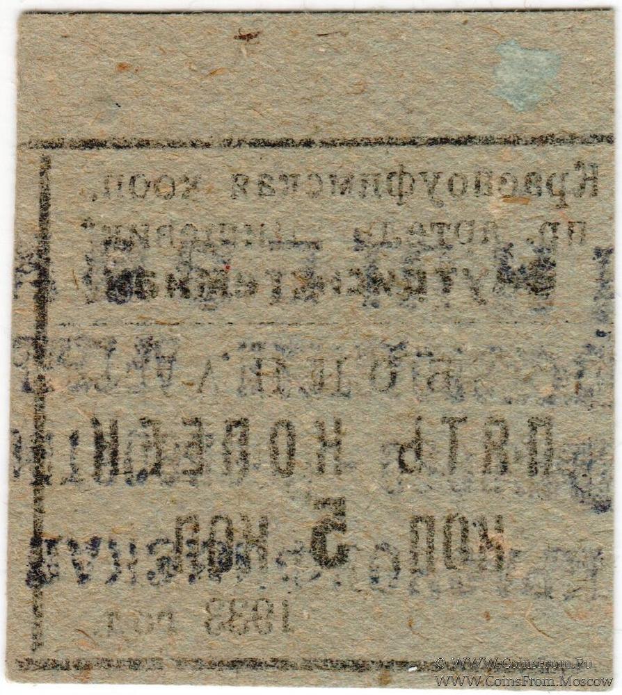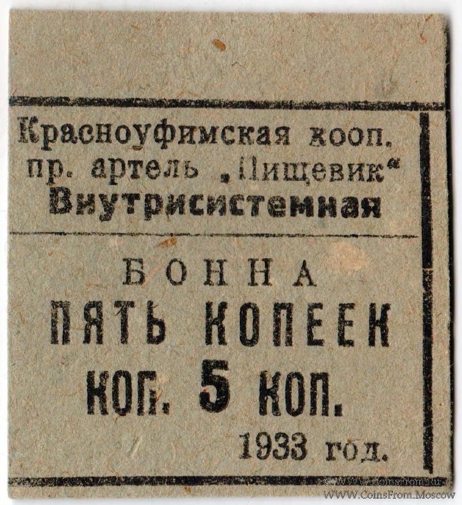 Внутрисистемная бонна 1933 г. Бумага серо-жёлтая. Красноуфимская Кооперативно-промысловая артель "Пищевик".