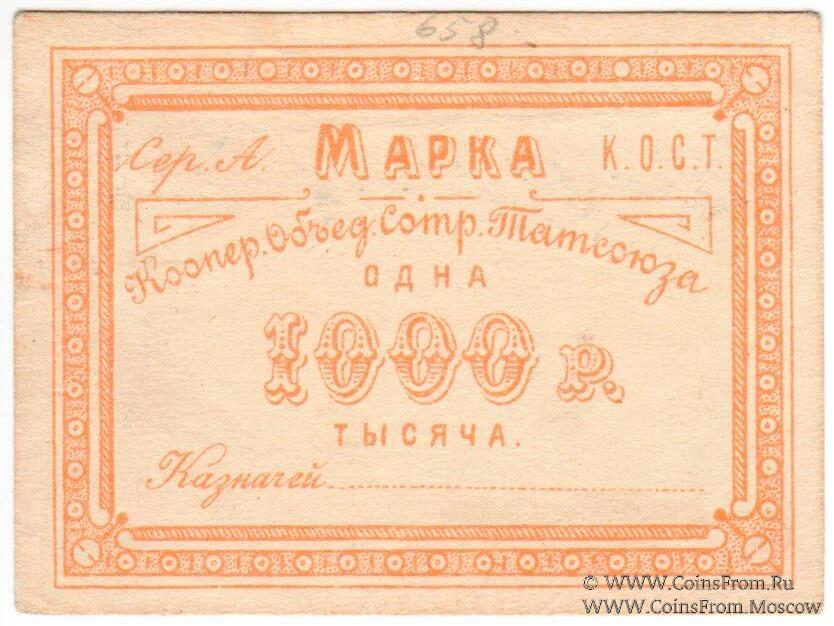 Марка. Без подписи на аверсе. Надпись номинала и подписи на реверсе 1.000 рублей. Кооператив Объединения Сотрудников Татсоюза (К.О.С.Т.).