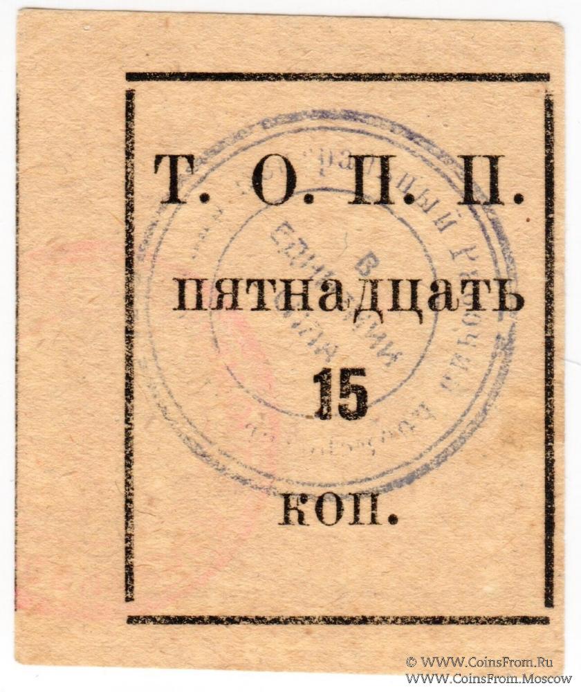 Печать (сиреневая) ЦРК на аверсе 15 коп. Т.О.П.П. Печать (красная) Т.О.П.П. на реверсе. Абкляч аверса на реверсе.