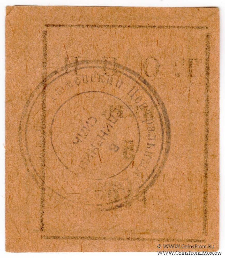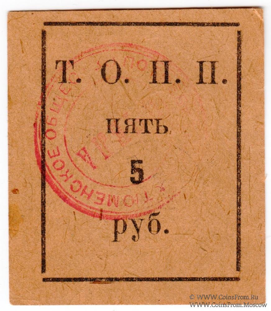 Без номера, без даты. Печать (синяя) ЦРК на реверсе 5 руб. Т.О.П.П. Печать (красная) Т.О.П.П. на аверсе. Абкляч аверса на реверсе. Бумага коричневая. Тюменский Центральный Рабочий Кооператив.