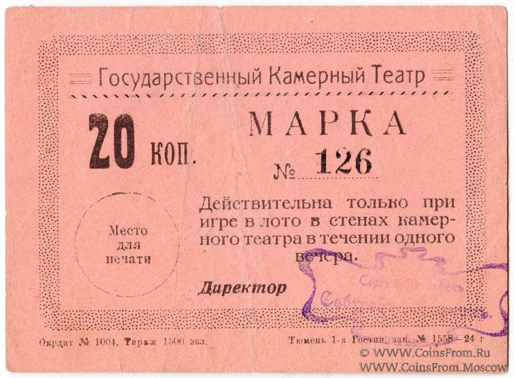 Марка без даты (1924 г.). На розовой бумаге. Бланк со штампом директора на аверсе. Тюменский Государственный Камерный Театр.