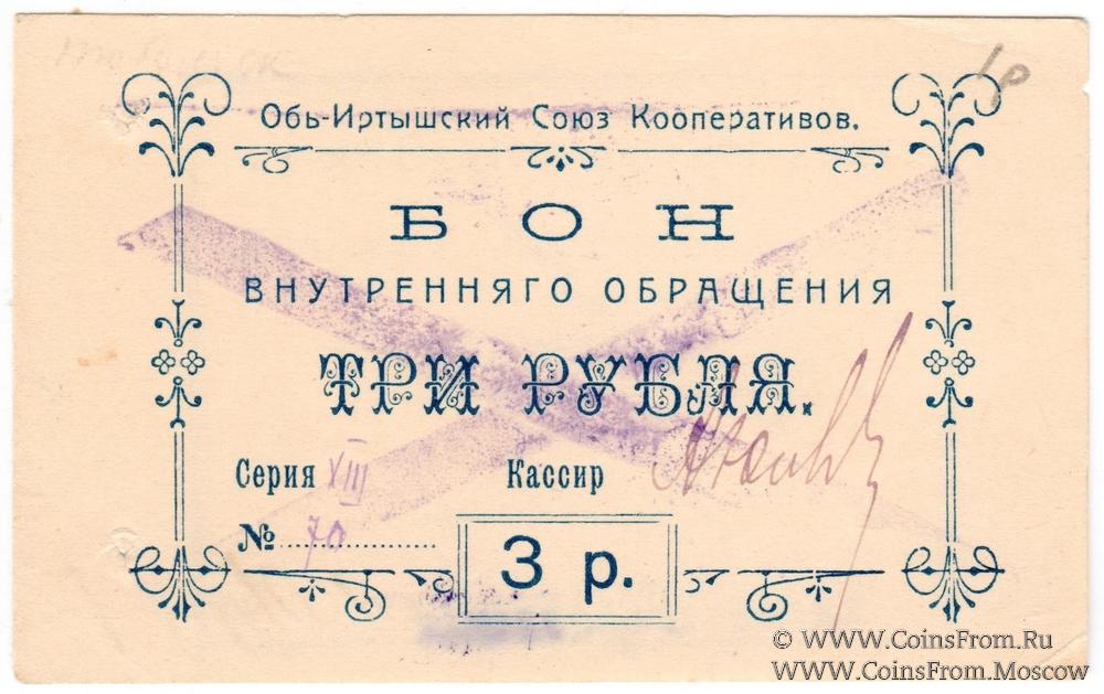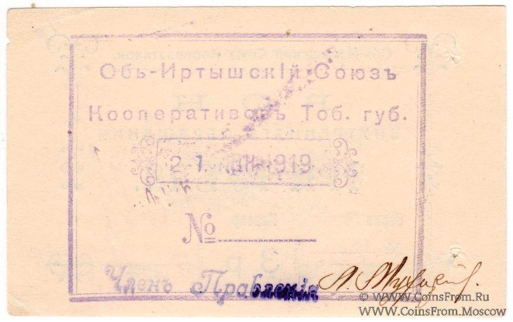 Бон. С оттиском штампа союза на реверсе и крестообразным гашением на аверсе. Обь-Иртышский Союз Кооперативов.