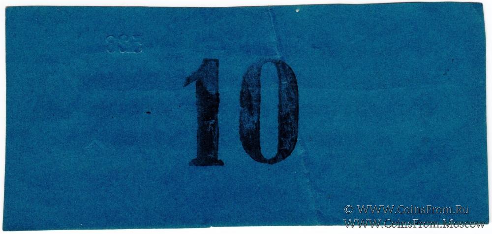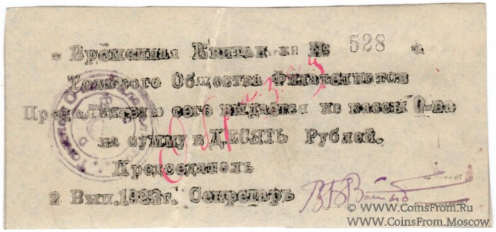 Временная квитанция. Выпуск 2: номинал прописью, напечатан. На аверсе: слово "ОБРАЗЕЦ" красными чернилами по диагонали; без подписи Председателя; номер напечатан. На реверсе: номинал "10" крупно. Томское общество филателистов.