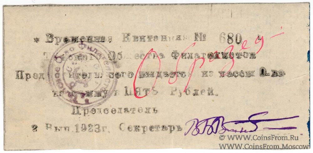 Временная квитанция. Выпуск 2: номинал прописью, напечатан. На аверсе: слово "ОБРАЗЕЦ" красными чернилами по диагонали; без подписи Председателя; номер напечатан. На реверсе: номинал "5" крупно. Томское общество филателистов.