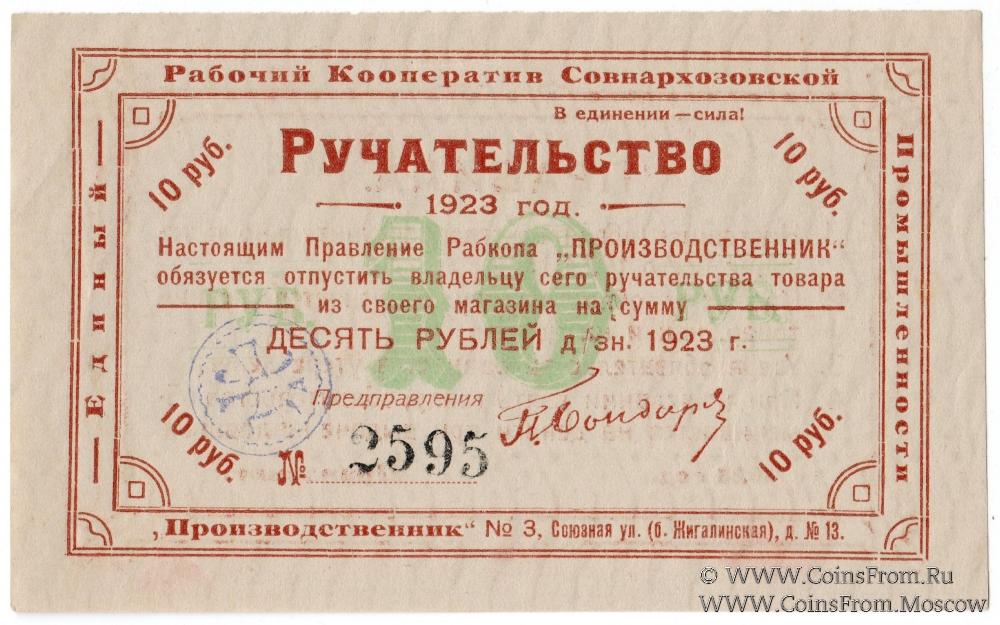 Ручательство. Единый Рабочий Кооператив Совнархозовской Промышленности "ПРОИЗВОДСТВЕННИК" № 3.