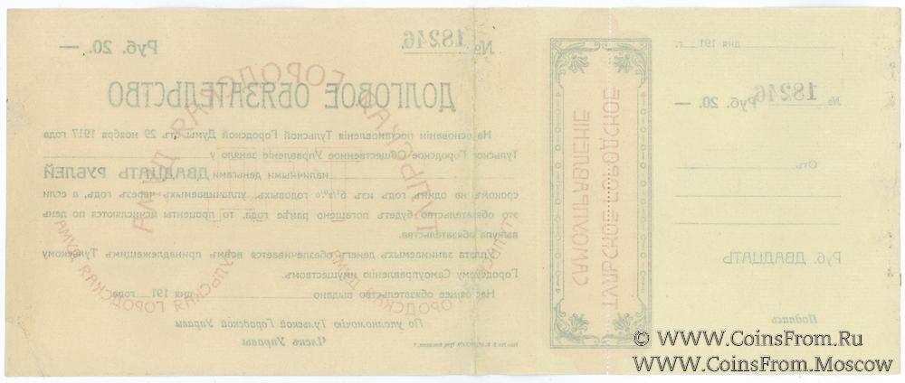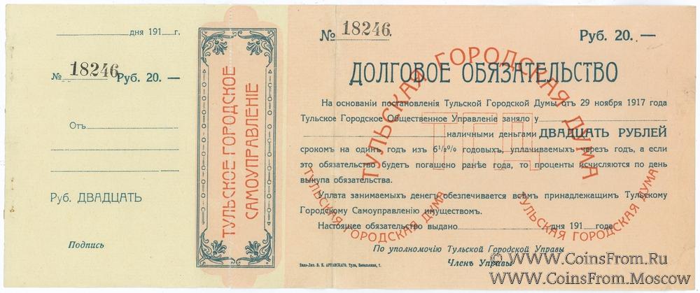 Долговое обязательство 1917 г. С корешком. Тульская Городская Дума. Тульское Городское Самоуправление.