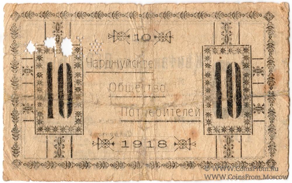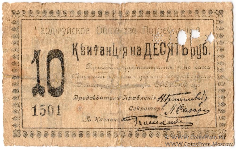 Квитанция 1918 г. Перфорация "*10 Р*". Чарджуйское Общество Потребитей.