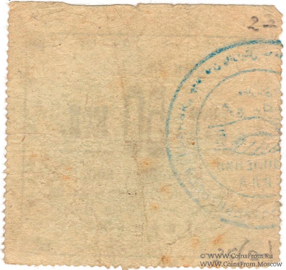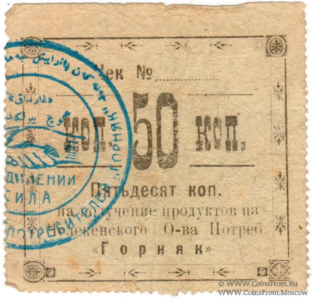 Чек без даты (1918 г.). Печать на аверсе. Рамка - "стрелки". Челекенское Потребительское общество "Горняк".