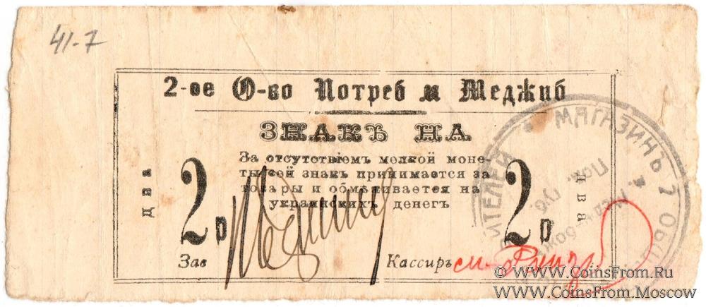 Знак без даты (1918 г.). Бумага линованная. С оттиском печати магазина общества и подписями ответственных лиц. 2-е Общество Потребителей м. Меджиб.