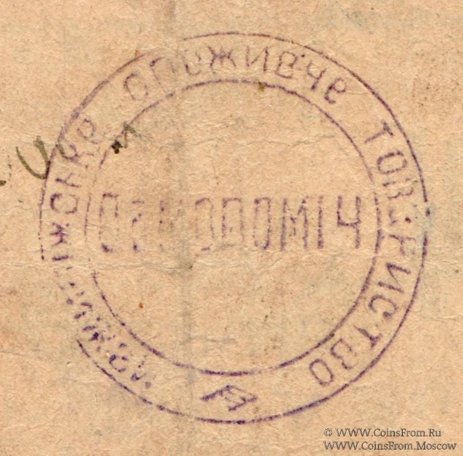 Печать круглая: "МЕДЖИБIЖСЬКА СПОЖИВЧЕ ТОВАРИСТВО *" (по кругу) "САМОПОМIЧ" (по центру) (рус.: Меджибожское потребительское общество САМОПОМОЩЬ)