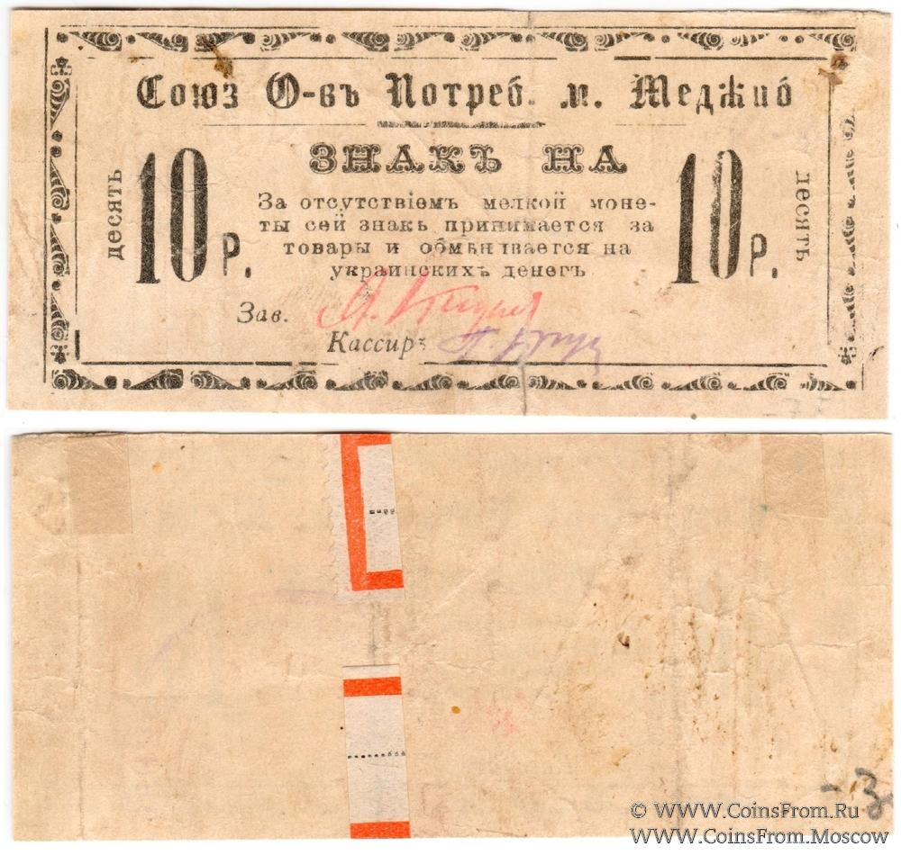 Знак без даты. Номинал цифрами и буквами. Вариант 2 рамки. Союз Обществ Потребителей Меджибож.
