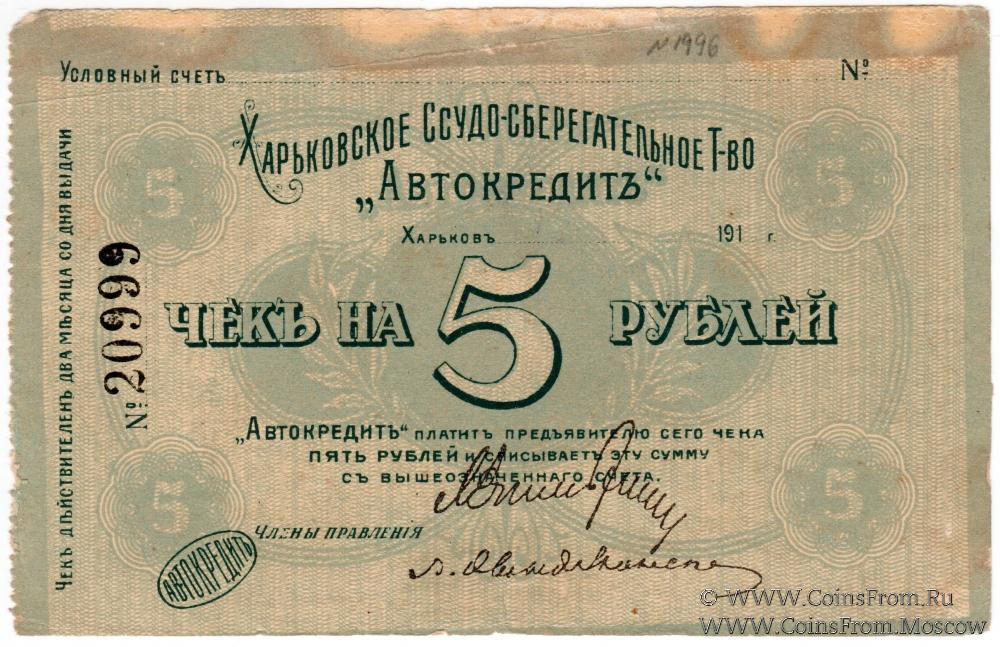 Чек 1919 г. Прямоугольный штамп на реверсе. Ссудо-сберегательное товарищество "АВТОКРЕДИТ".