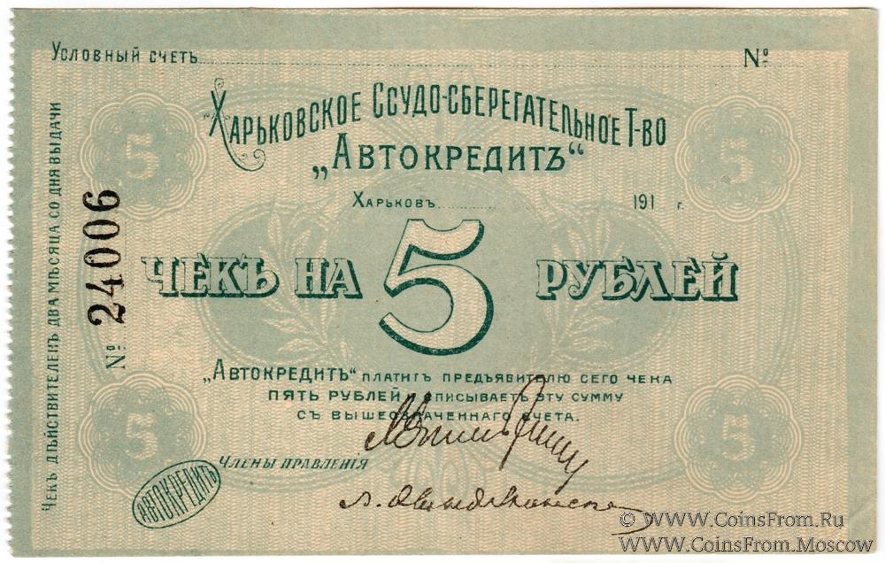 Чек 1919 г. Бланк. Ссудо-сберегательное товарищество "АВТОКРЕДИТ".