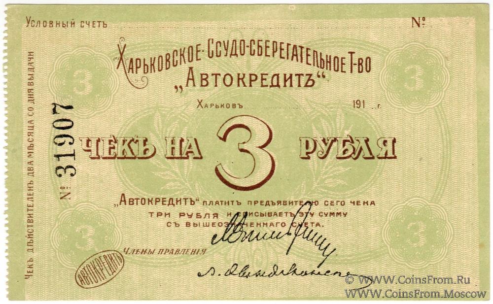 Чек 1919 г. Бланк. Бумага тоньше. Абкляч номера на реверсе. Ссудо-сберегательное товарищество "АВТОКРЕДИТ".