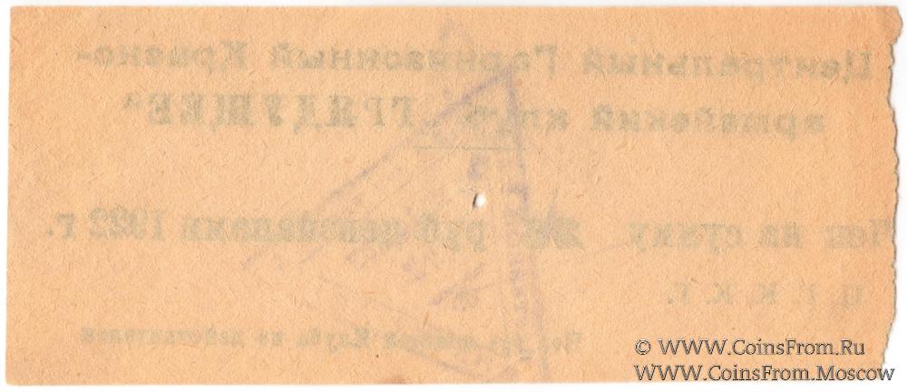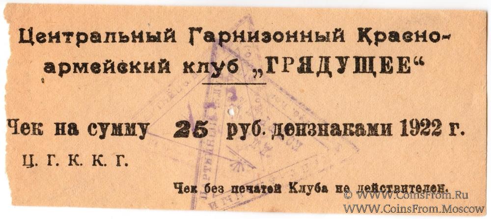 Чек дензнаками 1922 г. На аверсе 2 треугольных штампа. Бумага серо-желтая. Центральный Гарнизонный Красноармейский клуб "ГРЯДУЩЕЕ".