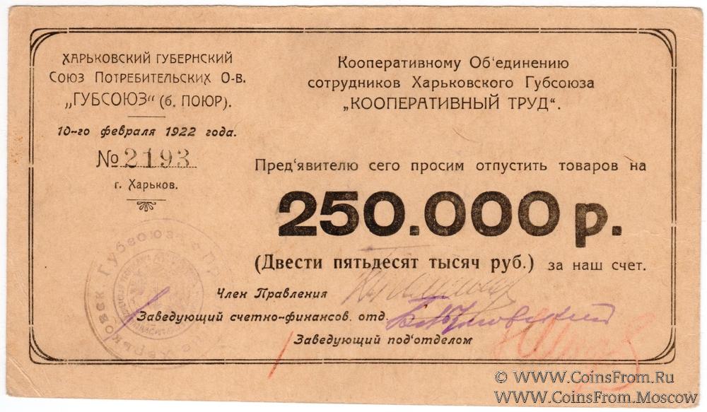 БРАК: частичный абкляч аверса на реверсе. Вариант подписей. Харьковский Губернский Союз Потребительских Обществ "ГУБСОЮЗ".