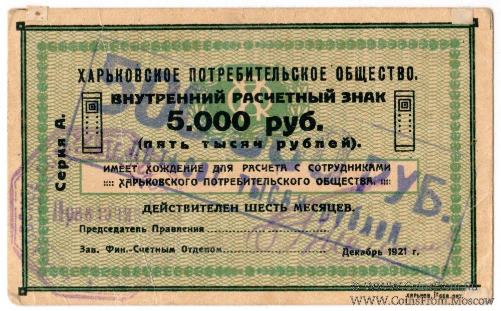 Внутренний расчётный знак 1921 г. Надпечатка номинала на аверсе 5.000 рублей. Харьковское Потребительское Общество (ХПО).