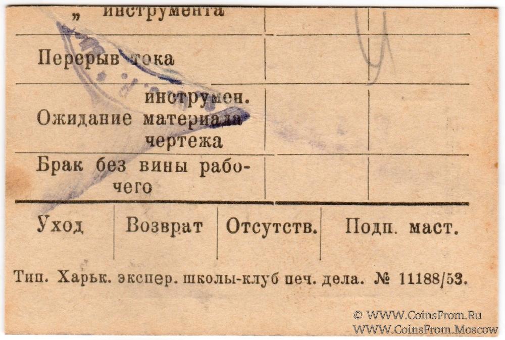 Бон без даты (1922 г.). На аверсе штамп красного цвета "8-55" "2-27". Подпись чёрная. Завод "Электросила" №1.