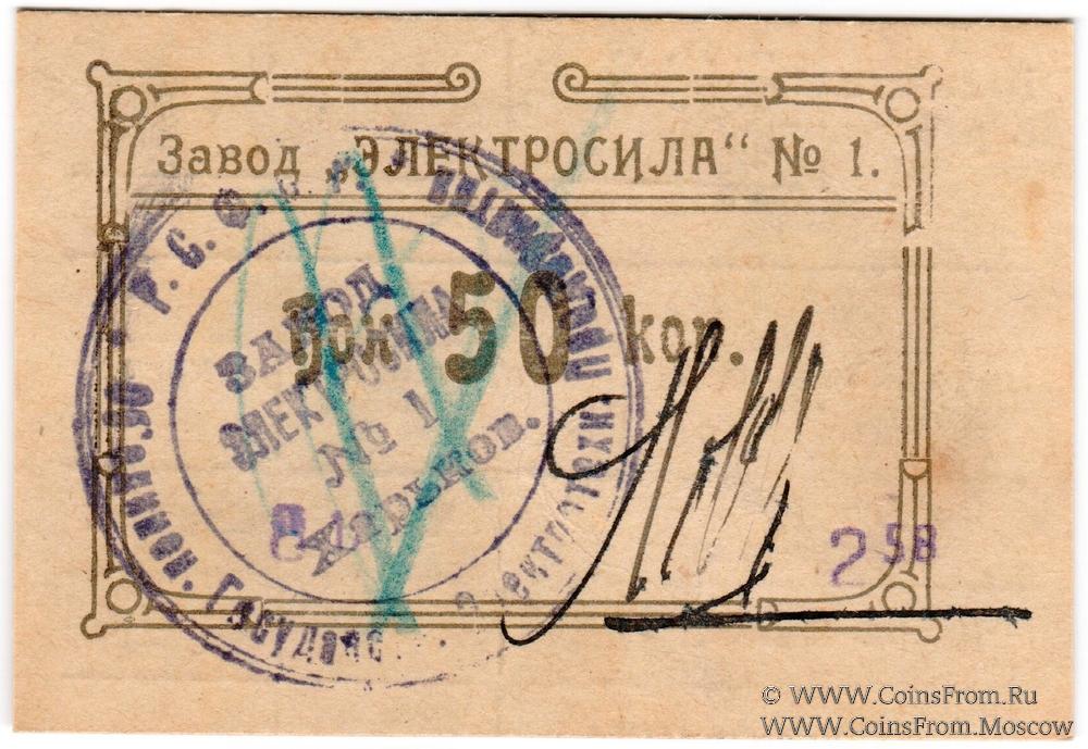 Бон без даты (1922 г.). На аверсе штамп сиреневого цвета "2-58". Подпись чёрная. Завод "Электросила" №1.