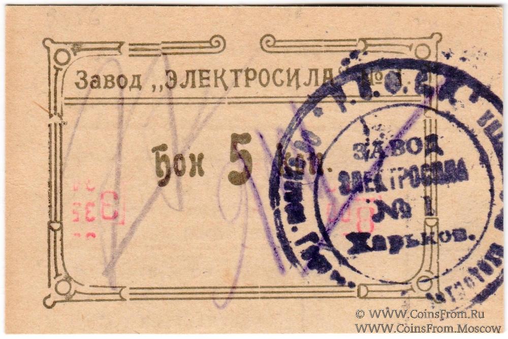 Бон без даты (1922 г.). На аверсе штамп красного цвета "3-35" и "8-00". Подпись сиреневая. Завод "Электросила" №1.