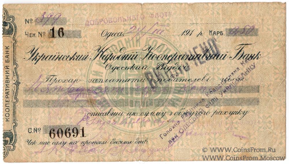 Главная > Магазин > Моя коллекция > Банкноты России периода Первой Мировой Войны, Гражданской войны, революции и первых лет Советской власти > Частные боны Гражданской войны > Украина > Одесская область > Одесса. Губернский город. > Украинский Народный Кооперативный Банк > Чек 50 копеек 1924 г. (Одесса)