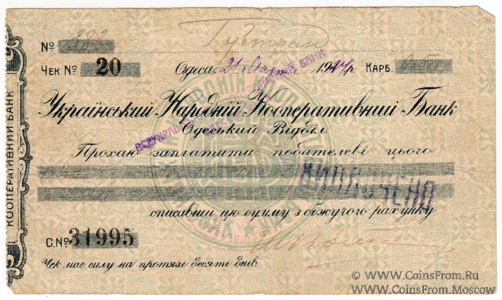 Чек 1924 г. Печать на аверсе. Рукописная надпись: "пятьдесят копеек". Украинский Народный Кооперативный Банк.