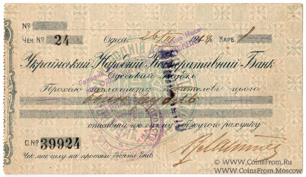 Чек 1924 г. Печать на аверсе. Рукописная надпись: "один рубль". Украинский Народный Кооперативный Банк.