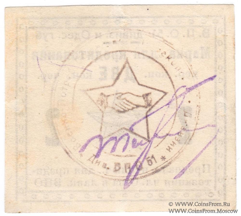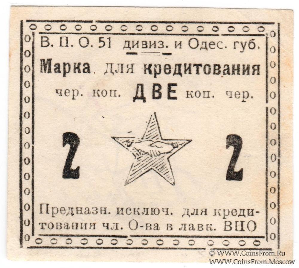 Марка для кредитования в червонных копейках без даты. С оттиском печати на обороте. В. П. О. 51 дивизии и Одесской губернии.