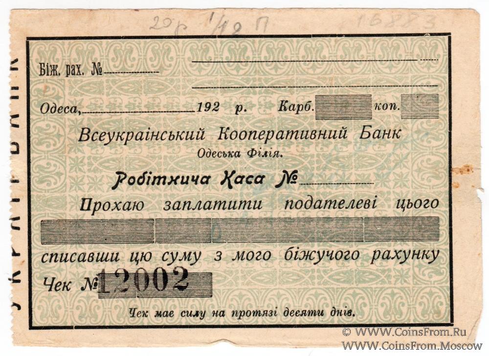 Чек в червонном исчислении 1924 г. Бланк. Всеукраинский Кооперативный Банк.