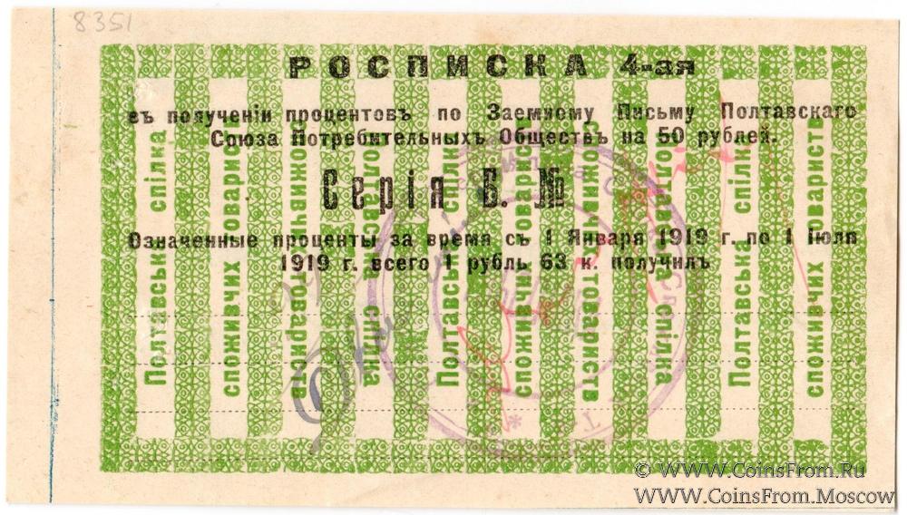 Печать круглая: "ГУБСПIЛКА" (по центру) / "Полтавська Губернiяльна Спiлка Споживчив Т-в (Товариств) *** " (по кругу). (ГУБСОЮЗ / Полтавский Губернский Союз Потребительских Обществ).