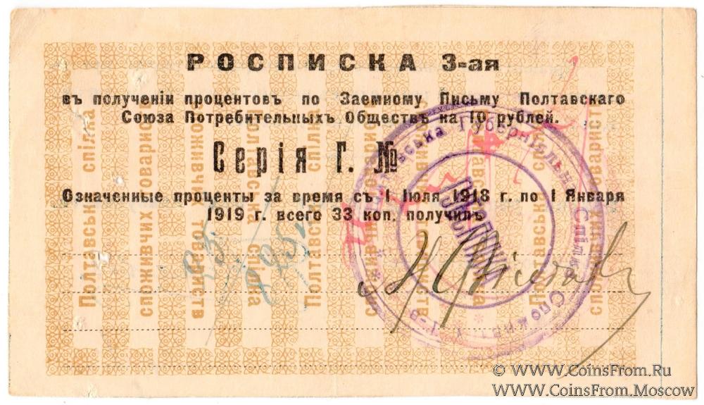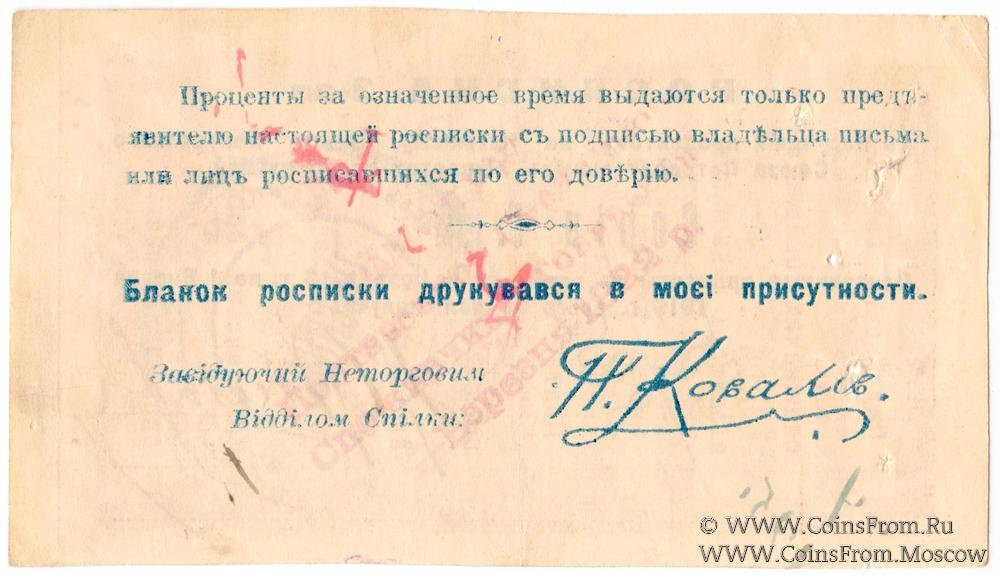 3-я Расписка (Росписка) 1917 (1922) г. Серия Г. На аверсе номер и сумма прописью (825.000) от руки, печать фиолетовая, подпись красная. На реверсе штамп 1922 г., текст синий. Полтавский Союз Потребительских Обществ (Полтавська спiлка споживчих товариств).