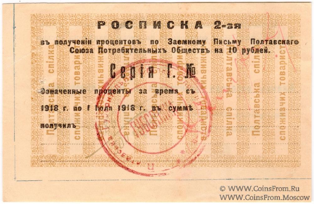 Печать круглая: "ГУБСПIЛКА" (по центру) / "Полтавська Губернiяльна Спiлка Споживчив Т-в (Товариств) *** " (по кругу). (ГУБСОЮЗ / Полтавский Губернский Союз Потребительских Обществ).