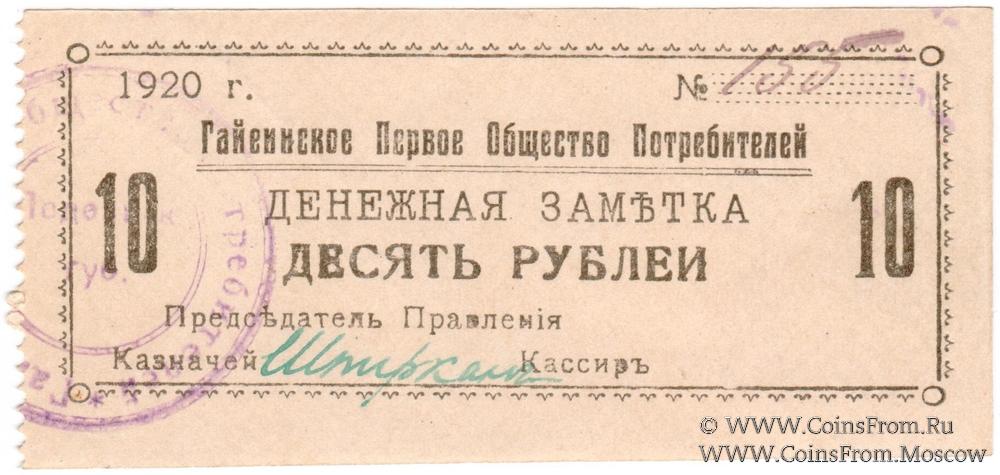 Денежная заметка 1920 г. Водяной знак - "паркет". Номер 3-значный. Гайсинское Первое Общество потребителей.