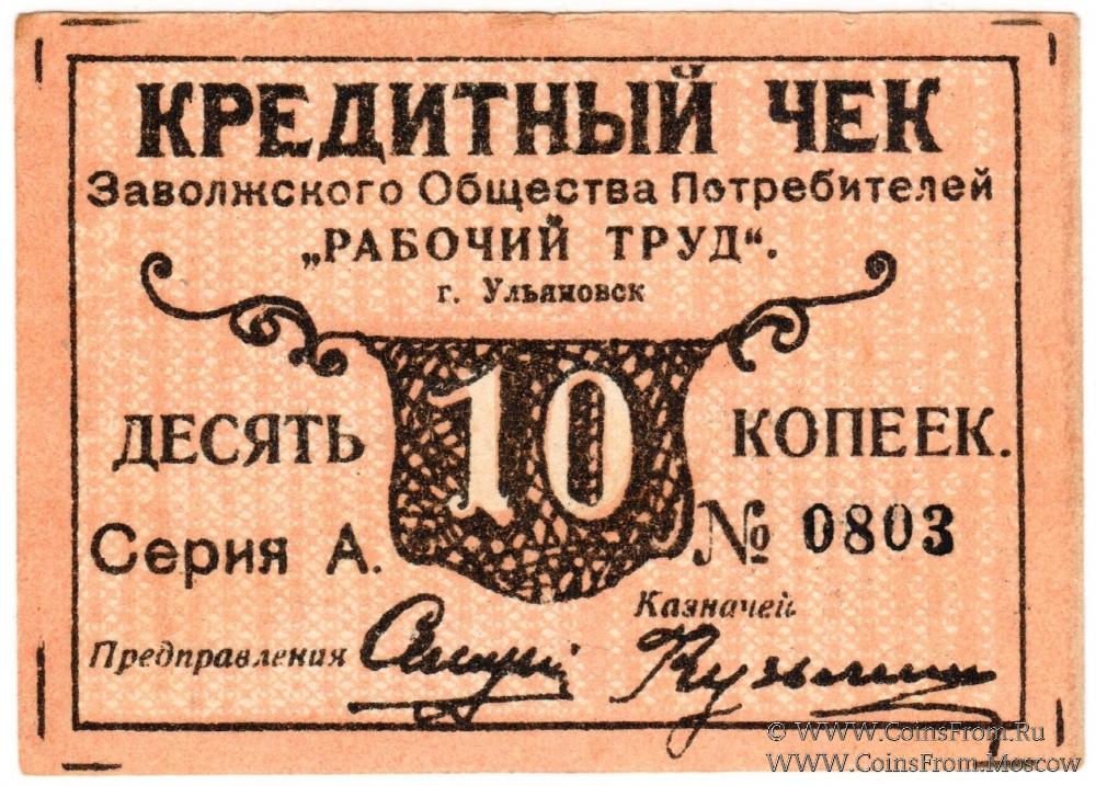 Кредитный чек без даты. Заволжское Общество Потребителей "Рабочий труд".