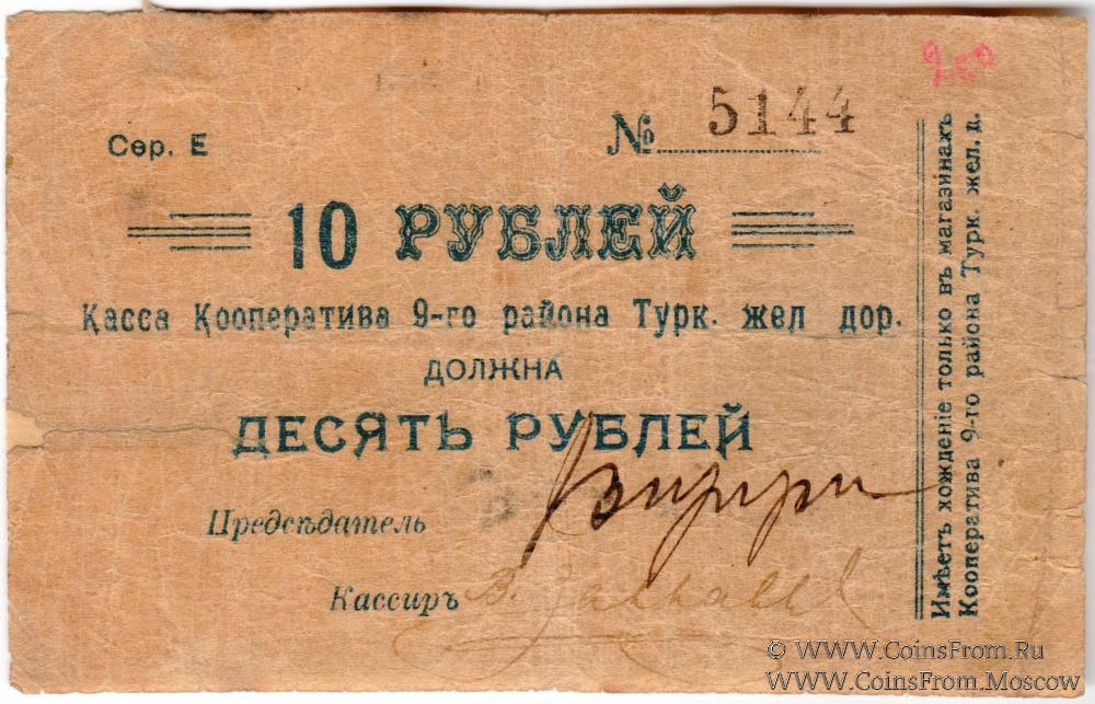 Серия Е. С подписями. Касса Кооператива 9-го района Туркестанской железной дороги.