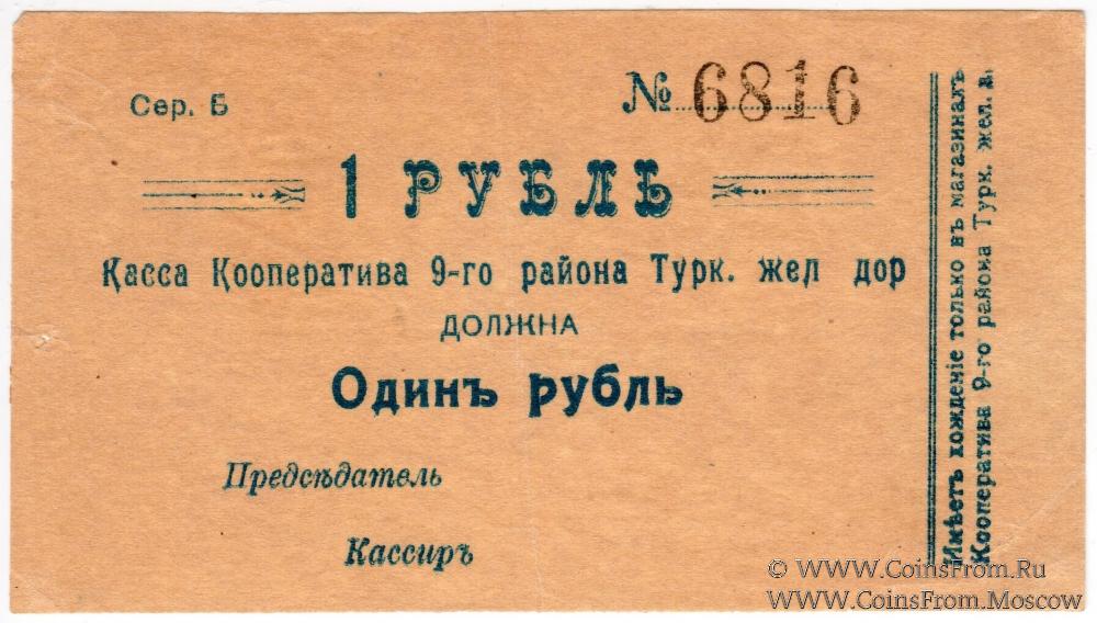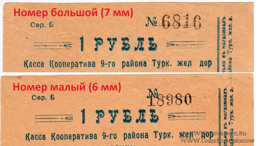 Серия Б. Номер 4-значный, крупный (7 мм). Касса Кооператива 9-го района Туркестанской железной дороги.