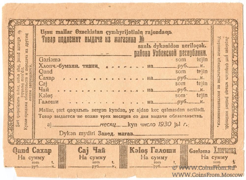 Обязательство 1930 г. Уполнаркомторг СССР в Средней Азии и Главный Хлопковый Комитет. Узбекская республика.