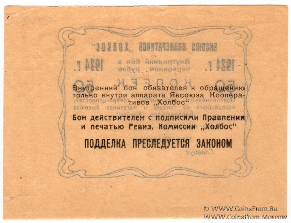 Внутренний бон в червонном рубле. Бланк. Бумага жёлтого оттенка. Яксоюз кооперативов "Холбос".